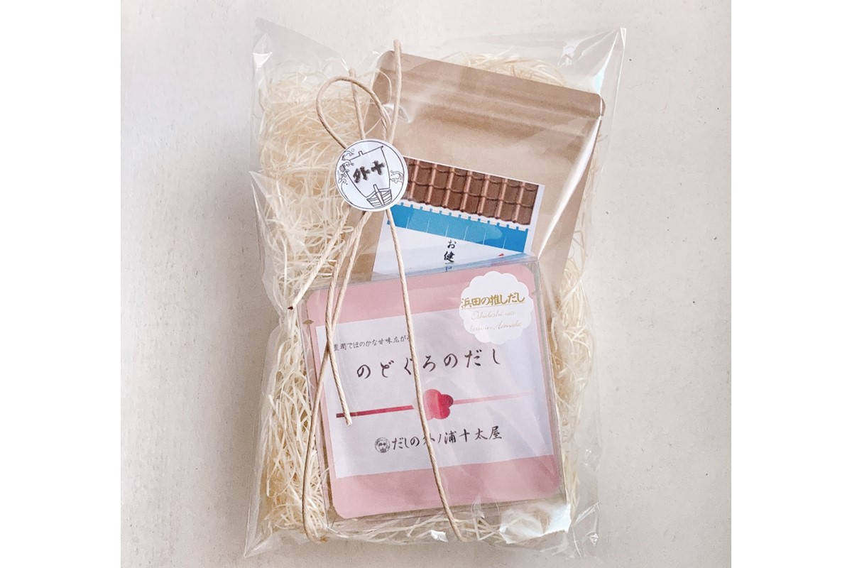 | 容量 | (1) 「お健やかに」、のどぐろ&あじブレンドだしパック(5g×3パック入り) 1個 (2) 「浜田の推しだし3種・アソートバッグ」、あじのだしパック(5g×1パック入り) 1個/のどぐろのだしパック(5g×1パック入り) 1個/かれいのだしパック(5g×1パック入り) 1個 |
