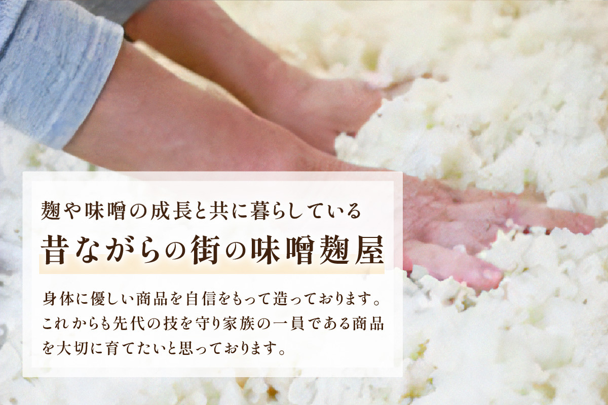 味噌は、開業以来の製法を守り、米・麹菌・大豆・塩以外の余計なものは入れず、身体に優しい商品を自信をもって造っております。これからも先代の技を守り家族の一員である商品を大切に育てたいと思っております。