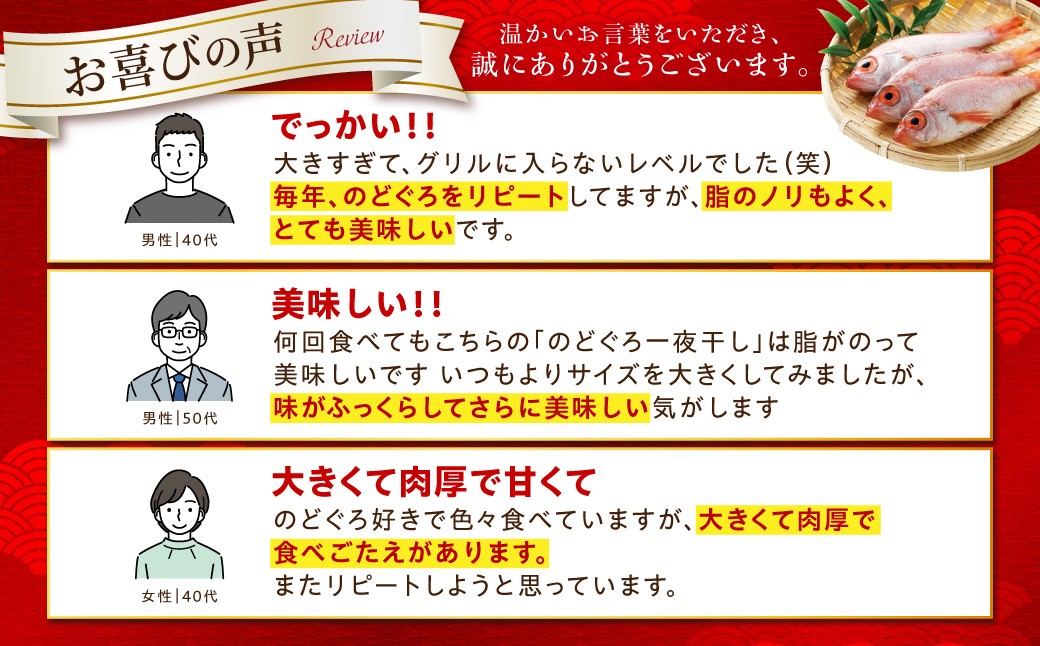 毎年、のどぐろをリピートしてますが、脂のノリもよく、とても美味しいです。