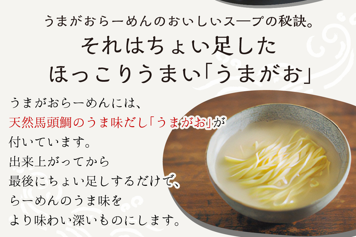 うまがおらーめんには、天然馬頭鯛のうま味だし「うまがお」が付いています。