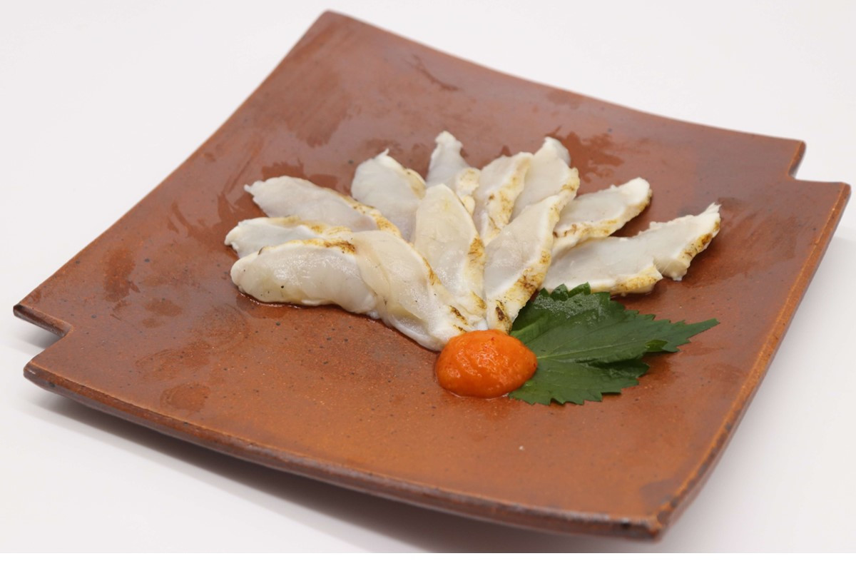 当社所属の沖合底びき網漁船あけぼの丸をはじめ、浜田漁港に所属する沖合底びき網漁船が、山陰沖で漁獲したマフグを三枚に卸し、特殊冷風乾燥機で余分な水分を除いた後、表面を軽く炙って旨味を閉じ込めました。