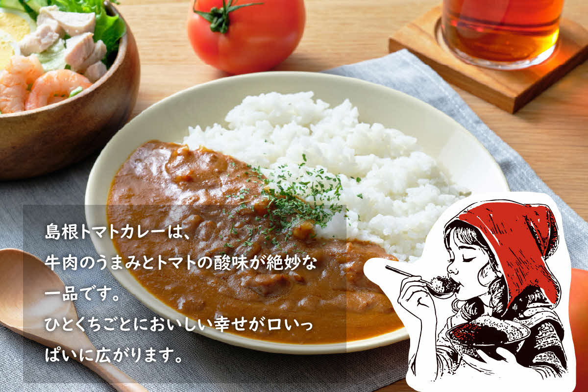 トマト(島根県産)、牛肉(島根県産)、カレールウ、玉ねぎ、ビーフオイル、砂糖、小麦粉、香辛料、にんにく、ビープパウダー、食塩、しょうが/調味料(アミノ酸等)、着色料(カラメル)、増粘剤(加工でん粉)、酸味料、乳化剤、(一部に小麦・牛肉・大豆・鶏肉・豚肉・ゼラチンを含む)