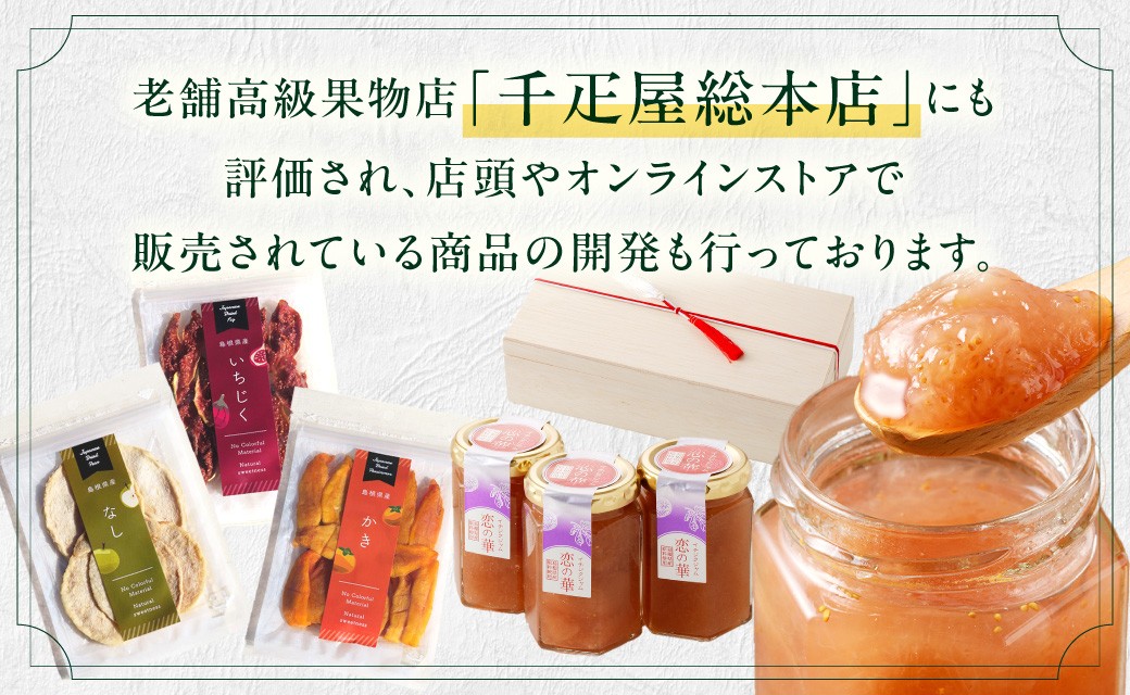 弊社は島根県浜田市特産の「西条柿」と「梨」、島根県特産の「いちじく(蓬莱柿)」、浜田市産の「トマト」を一口サイズにカットし乾燥させたドライフルーツや、島根県浜田市産の「若桃」を使ったグラッセなどを加工販売しています。