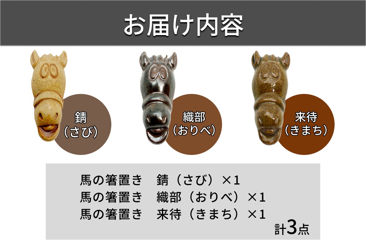 | 容量 | 馬の箸置き 錆(さび)×1 馬の箸置き 織部(おりべ)×1 馬の箸置き 来待(きまち)×1 |