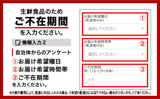 ※お客様の都合により商品を受け取れなかった場合、または受け取りまでに期間がかかった場合は、生鮮品につき返品・再配送は致しかねますので予めご了承ください。