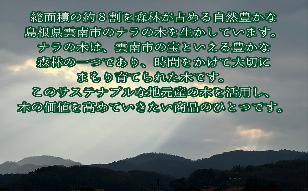 ナラの木は、雲南市の宝といえる豊かな森林の一つであり、時間をかけて大切に守り育てられた木です。