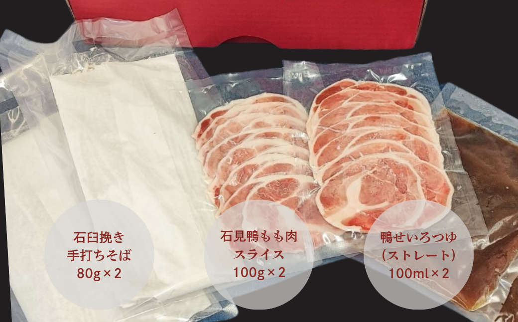| 容量 | ・石臼挽き手打ちそば1食80g×2 ・石見鴨もも肉スライス1食100g×2 ・鴨せいろつゆ(ストレート)1食100ml×2 |