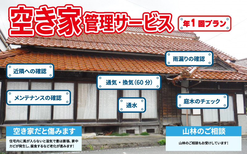 | 容量 | 【サービス内容】 年1回通気・換気(60分程度)/通水/掃き清掃/庭木のチェック/雨漏りの確認/メンテナンスの確認/近隣訪問/郵便ポスト内の整理…その他有事後の巡回など。訪問後、建物等の状況確認・報告書(状況写真添付)をご提出します。 ○お申込み後書留にて申込み請け書をお送りします。ご希望の日程を電話にてご連絡ください。 ○サービスの詳細は電話にてお問い合わせください(増田住建空家管理サービス係 TEL050-5207-5207)。 |
