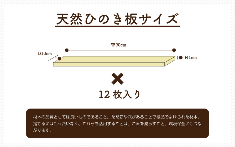 全国第3位の森林県、島根県邑南町で育つ天然ひのきを使い、大手メーカーが販売する「すのこベッド」の部品用に作ったひのき板の中でも節や穴があることで、検品でよけられた材木を「訳あり品」としてDIYに使えるひのき板セットにしました。