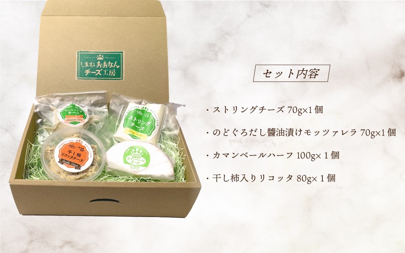 チーズ 国産チーズ 熟成チーズ 島根 おつまみ ワイン 酒 ナチュラルチーズ4種(ストリング・のどぐろだし醬油漬けモッツァレラ・カマンベールハーフ・干し柿入りリコッタ)