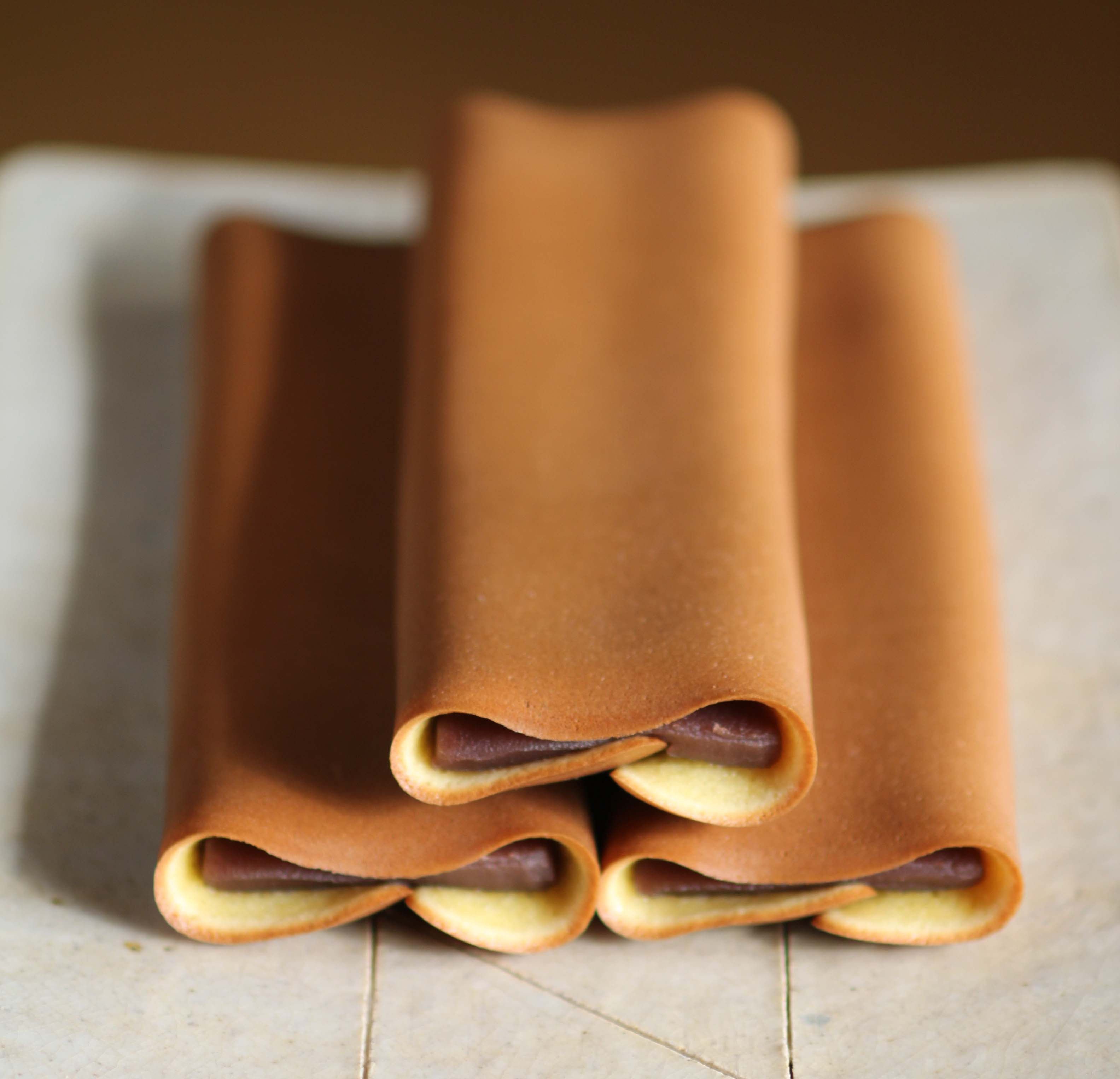 香ばしくキツネ色に焼いたうすいカステラ生地でこし餡を巻いた焼き菓子。