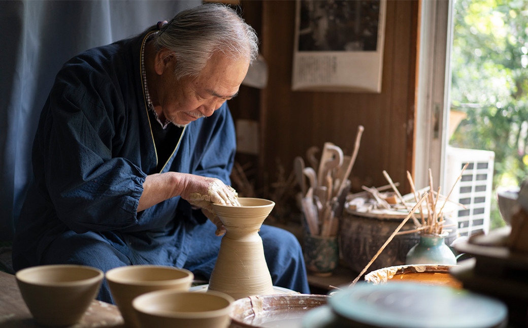 津和野町で行っている製造加工工程:原材料の仕入れ、成形、絵付、焼成、梱包
