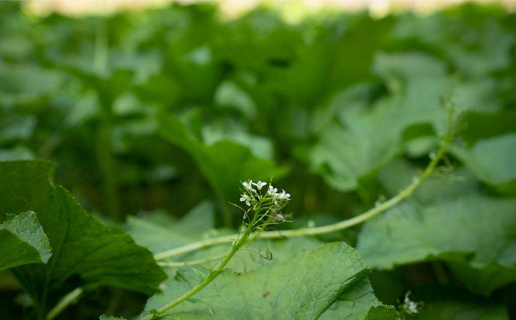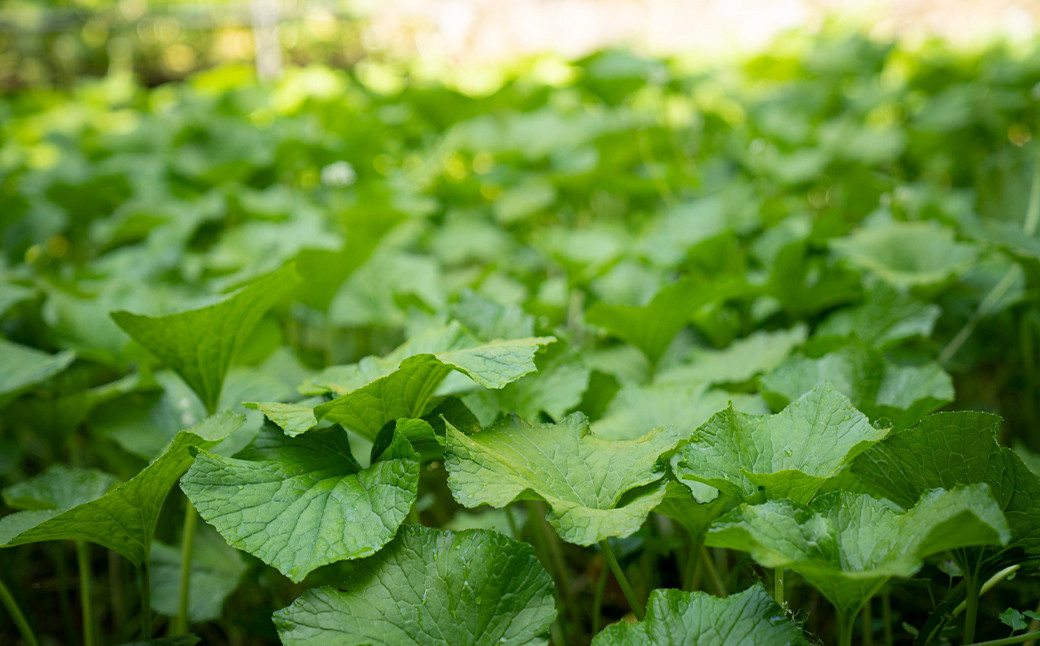 わさび漬にしている葉や茎は、若いものだけを摘んで漬け込んでいます。