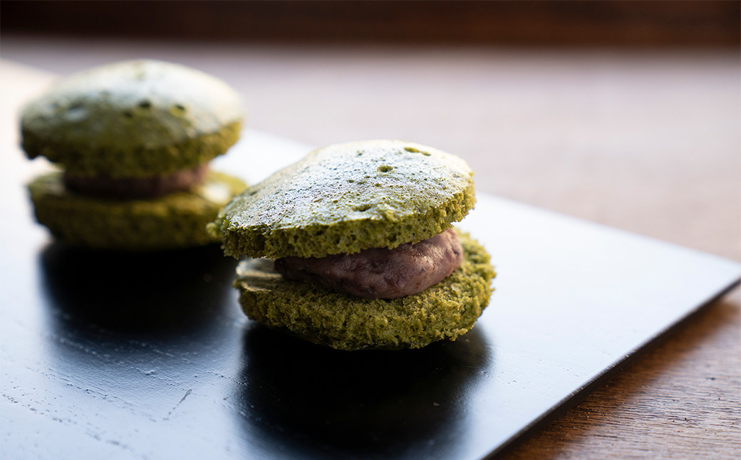 抹茶をふんだんに使い蒸し上げた生地に、自家製粒あんを挟みました。