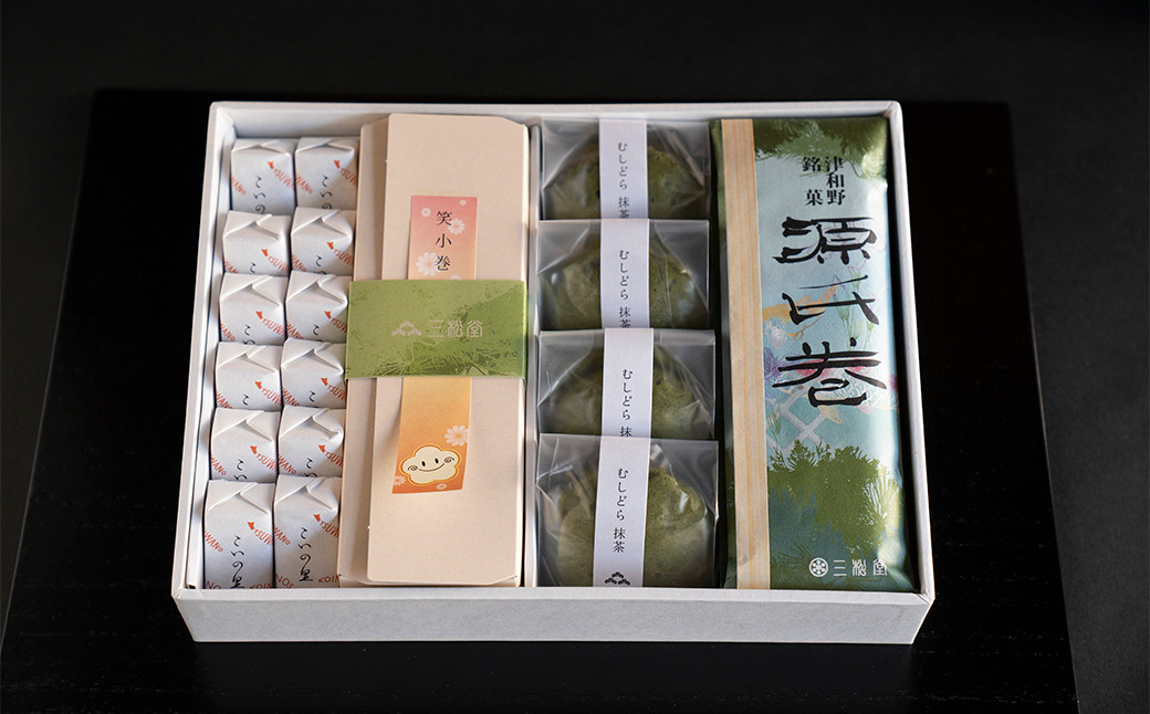 『源氏巻』は津和野で古くから作られている、香ばしくキツネ色に焼いたうすいカステラ生地であんを巻いた焼き菓子です。町内の多くの和菓子店で作られていますが、三松堂では自慢のこしあんを巻いています。『笑小巻』は源氏巻を食べやすくカットし、かわいい焼き印を押したもの。季節ごとに焼印が変わり、目を楽しませてくれます。『むしどら抹茶』は、抹茶をふんだんに使い蒸し上げた生地に、自家製粒あんを挟みました。原料の小麦は国内産を使用しています。