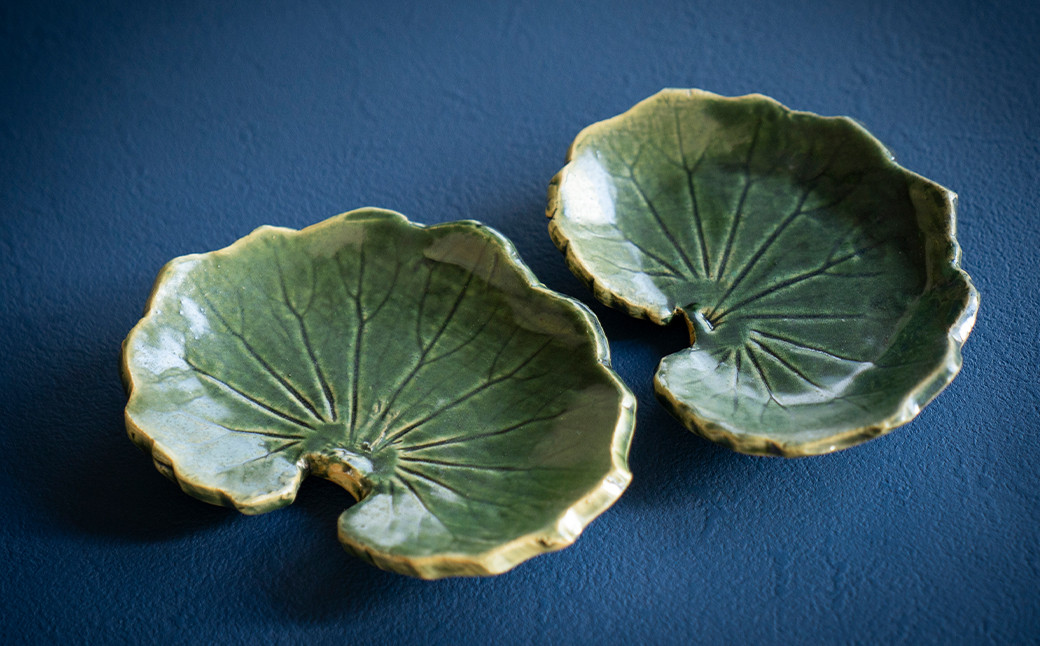 つわぶきの葉を原型として、1枚ずつ手作りなので、型や色合いなどが写真とは若干異なります。