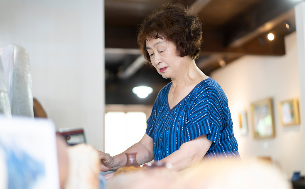 津和野で生まれ育ち、国内外に移り住んだのち、再び故郷に戻って作陶に励む陶芸家・中尾厚子さん。津和野の自然豊かな情景を常に思い浮かべながら創作を続けているという中尾さんは、乾いた大地の亀裂や樹齢を重ねた古木の樹皮の自然なひび割れに心惹かれ、陶土が乾く際に現れる亀裂にも面白みを見出します。収縮率が異なるよう数種の土をブレンドした陶土を二層に貼り合わせる「土被せ」技法を確立し、以来、陶土の自然な亀裂を技で引き出す「裂華紋」と呼ばれる独自の作品群が中尾さんの主要作品に。「日展」には計7回入選。都知事賞等受賞。