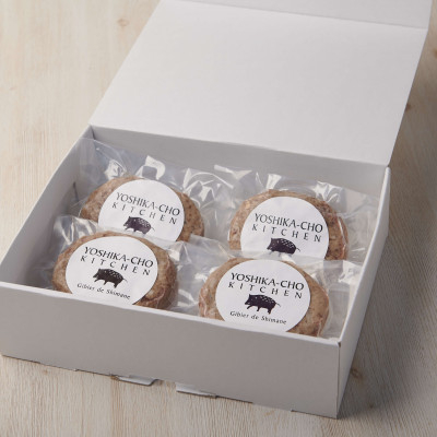 山の恵みを召し上がれ! 島根県近隣の豊かな自然の中で育ったイノシシを100%使用したハンバーグ。信頼できる猟師さんから仕入れるので、絞め方はバッチリです。味わいに大きな差が出ます。だからこそ、ジビエ本来の味わいを楽しんでいただくために、つなぎを極力少なくしました。また、化学調味料は使用せずシンプルな味付けながら、クセがなくジューシーで滋味深い味わいを楽しめます。 栄養価が高く、体に優しいハンバーグです。 ~ジビエハンバーグの焼き方~ ※冷蔵庫内にて自然解凍しておきます。 1. オイル小さじ1杯をフライパンに入れ、よく熱します。 2. 中火にしてハンバーグをのせ、両面に焼き色がつくまで焼きます。 片面約1分ほど/2個目安 3. 両面に焼き色がついたら再度ひっくり返して、50㏄の日本酒(なければ水でも可)を入れ蓋をして10分、焦げないように注意して弱火で蒸し焼きにします。 4. 10分経ったらひっくり返し、蓋をしながらさらに1分焼きます。 5. 竹串で中央部分を刺して、透明な肉汁が出てきたら完成。 (汁がまだ赤みがあるようならプラス30秒焼きます) ■生産者の声 ジビエで食文化をもっと豊かに。よしか町キッチンは、四方を山に囲まれた豊かな自然の中にあり、すぐそばを国土交通省の水質調査において、水質が最も良好な河川(※)に何度も選定された高津川が流れています。 清らかな水で育まれた農作物やジビエは、特別な味わいを有しています。その特別な素材でプレミアムなハンバーグをつくりました。クセがなく食べやすいので、ジビエが苦手だったという方からもご好評をいただいています。 (※)国土交通省が実施している水質調査のうち、以下の両方の条件を満たす河川。 ・各調査地点のBOD年間平均値について、全調査地点で平均をとった値が0.5mg/L ・各調査地点のBOD75%値について、全調査地点で平均をとった値が0.5mg/L ■注意事項/その他 画像はイメージです。 地場産基準:ハンバーグの製造工程のうち、原材料の仕入れから加熱・成型等の調理、梱包までの工程を町内加工所にて行っています。