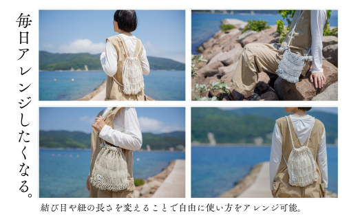 巾着型のつかりは、紐の長さや結び方を変えることで、リュックとしても、肩掛けや手持ちとしても自由にアレンジできます。