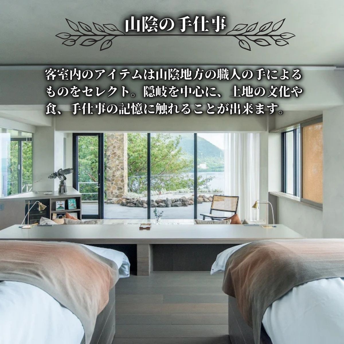 泥染めファブリックが室内に重厚な品格をもたらします。隠岐の風土と調和したシックな空間が、滞在を真の特別な時間へと昇華させます。