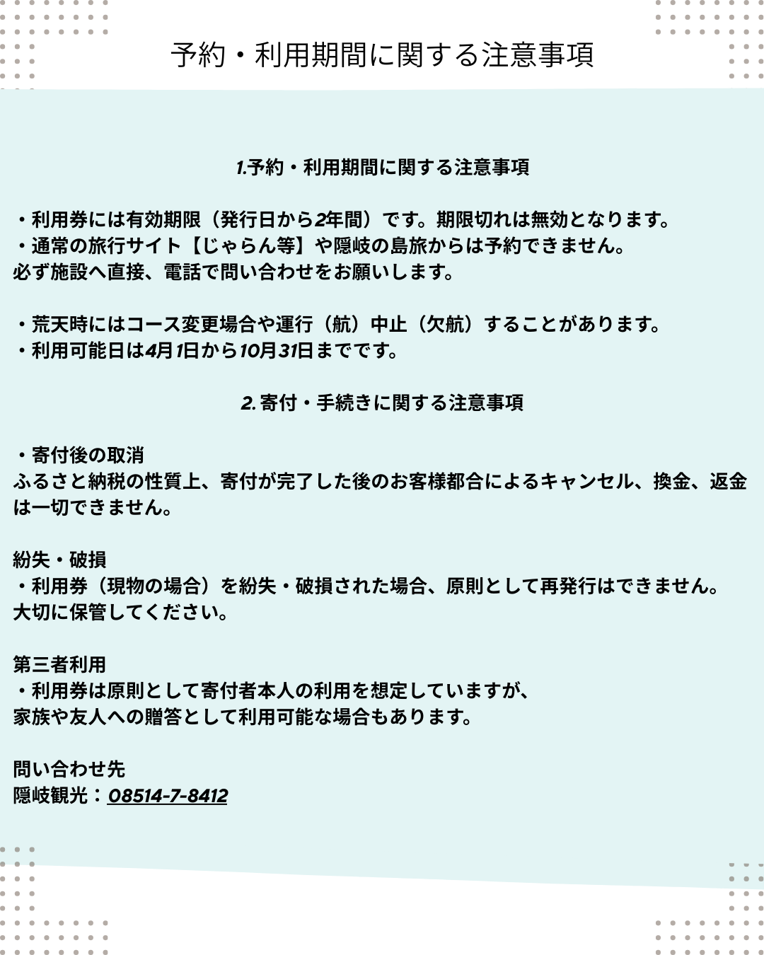 ご寄附のお手続き後、「隠岐観光観光船利用券」を寄附者様へお送りいたします。