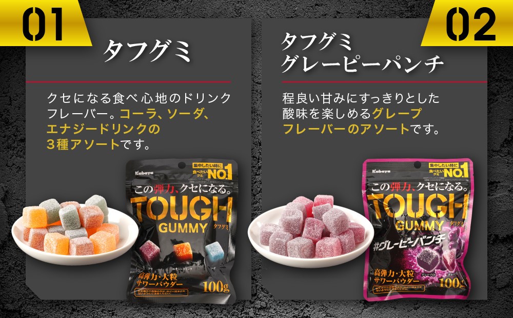 この弾力、クセになる。集中したいときに食べたいグミブランドNo.1! カバヤ タフグミ 4種×3袋 計12袋(タフグミ・グレーピーパンチ・おまかせ2種)<集中したい時に食べたいグミブランドNo.1>