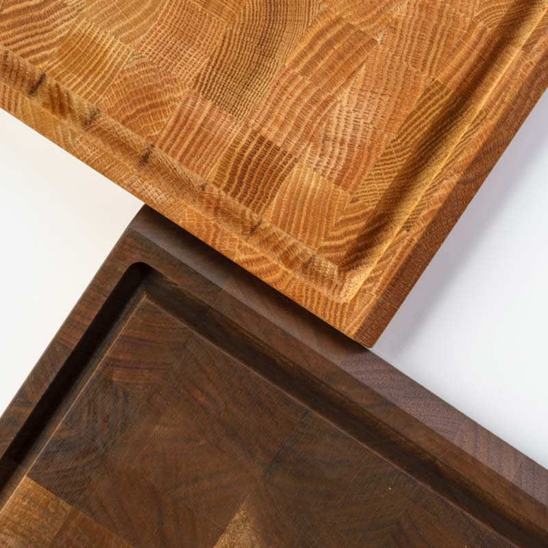 無垢材の木口面を使った「長く使えるカッティングボード」カッティングボードや、料理を盛り付けて食卓に並べることもできる木製ボードです。