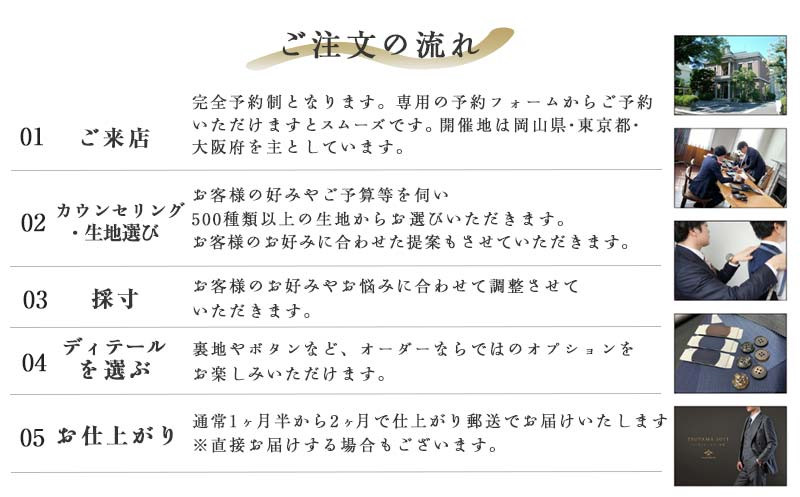 ※専用の予約フォームから定期的に開催されるオーダー会にご予約をいただき、採寸させていただきます。採寸会場は、津山市・大阪府・東京都等の会場があります。