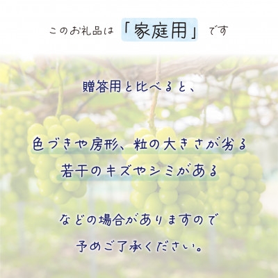 ※ご家庭用は贈答用と比べると、色づきや房形が劣る、粒が小さい、表面や傷やしみがある、などの場合がありますので予めご了承ください。