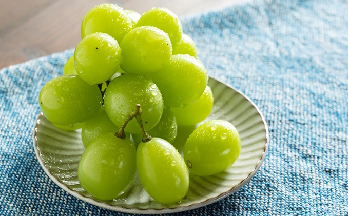 種が無く、皮ごと食べられ、粒が大きく、きれいな翡翠色をした、全国的にも人気沸騰中シャインマスカット。パリッとした歯ごたえと、上品な甘さが人気です。
