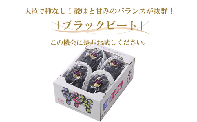 種が無く大粒のブラックビートとは、黒ぶどうを代表する2つの品種である「藤稔」と「ピオーネ」を交配して生まれた新しい品種で、「黒ぶどうのサラブレッド」ととも呼ばれています。果皮は黒に近い紫黒色で、甘味と酸味のバランスが良く、果肉はしっかりしていて弾力があり、かじると果汁が口の中に広がります。