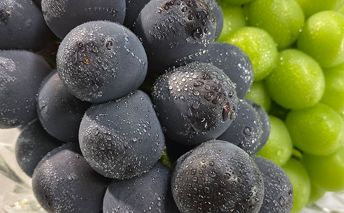 Nini farmで栽培された、皮ごと食べれて甘くて美味しい、大人気のシャインマスカットと程よい甘さでジューシーな長年親しまれている葡萄の種無しニューピオーネ。