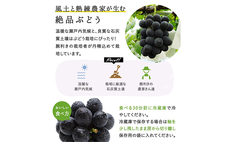 皮離れがよく、口いっぱいにほおばる程の粒の大きさは非常に食べ応えがあり、大人気のぶどうの一つです。