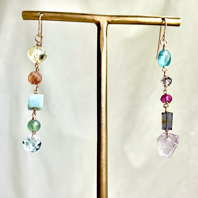 透明度の高い色とりどりの石を繋いだK14gfロングフックピアスです。