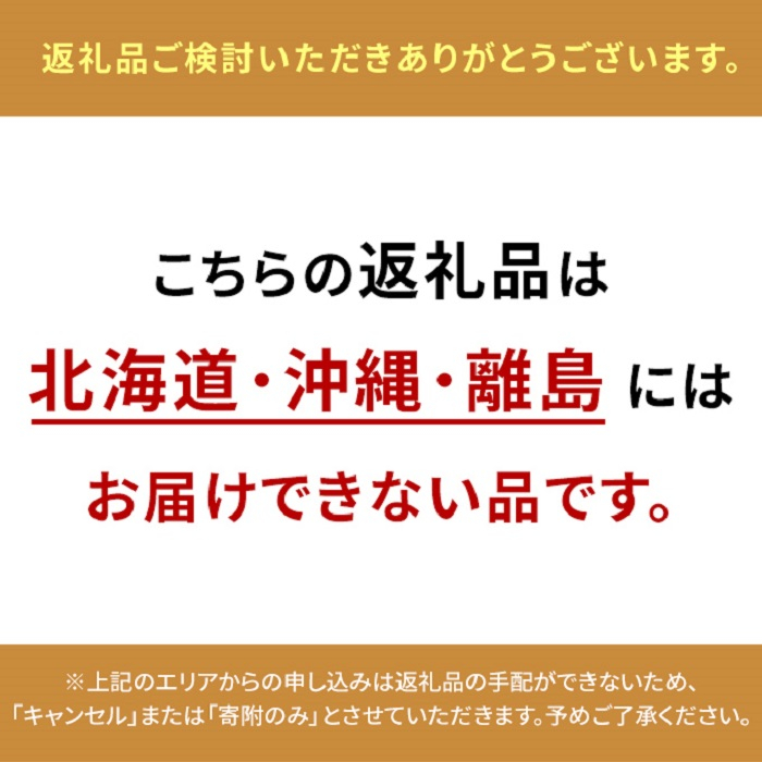 ※上記のエリアからの申し込みは返礼品の手配が出来ないため、「キャンセル」または「寄附のみ」とさせていただきます。予めご了承ください。