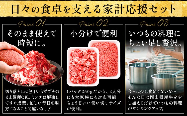 チョイスPayポイントと交換できる品 毎日の料理にちょうどいい最強セット 牛肉 国産 切り落とし ミンチ セット 家計応援 岡山県産牛 選べる 1kg 2kg 3ヶ月定期便 6ヶ月定期便 小分け 1パック250g お試し 大容量《60日以内に出荷予定(土日祝除く)》岡山県 笠岡市 肉 ひき肉 グルメ お取り寄せグルメ 定期便は翌月から発送