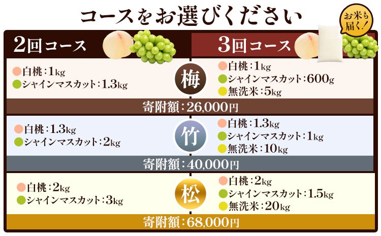 | 容量 | 【2回コース】 ■梅:白桃1kg/シャインマスカット1.3kg ■竹:白桃1.3kg/シャインマスカット2kg ■松:白桃2kg/シャインマスカット3kg 【3回コース】 ■梅:白桃1kg/シャインマスカット600g/無洗米5kg ■竹:白桃1.3kg/シャインマスカット1kg/無洗米10kg ■松:白桃2kg/シャインマスカット1.5kg/無洗米20kg 米 使用割合:複数原料米 国内産 10割 (岡山県産 10割) |