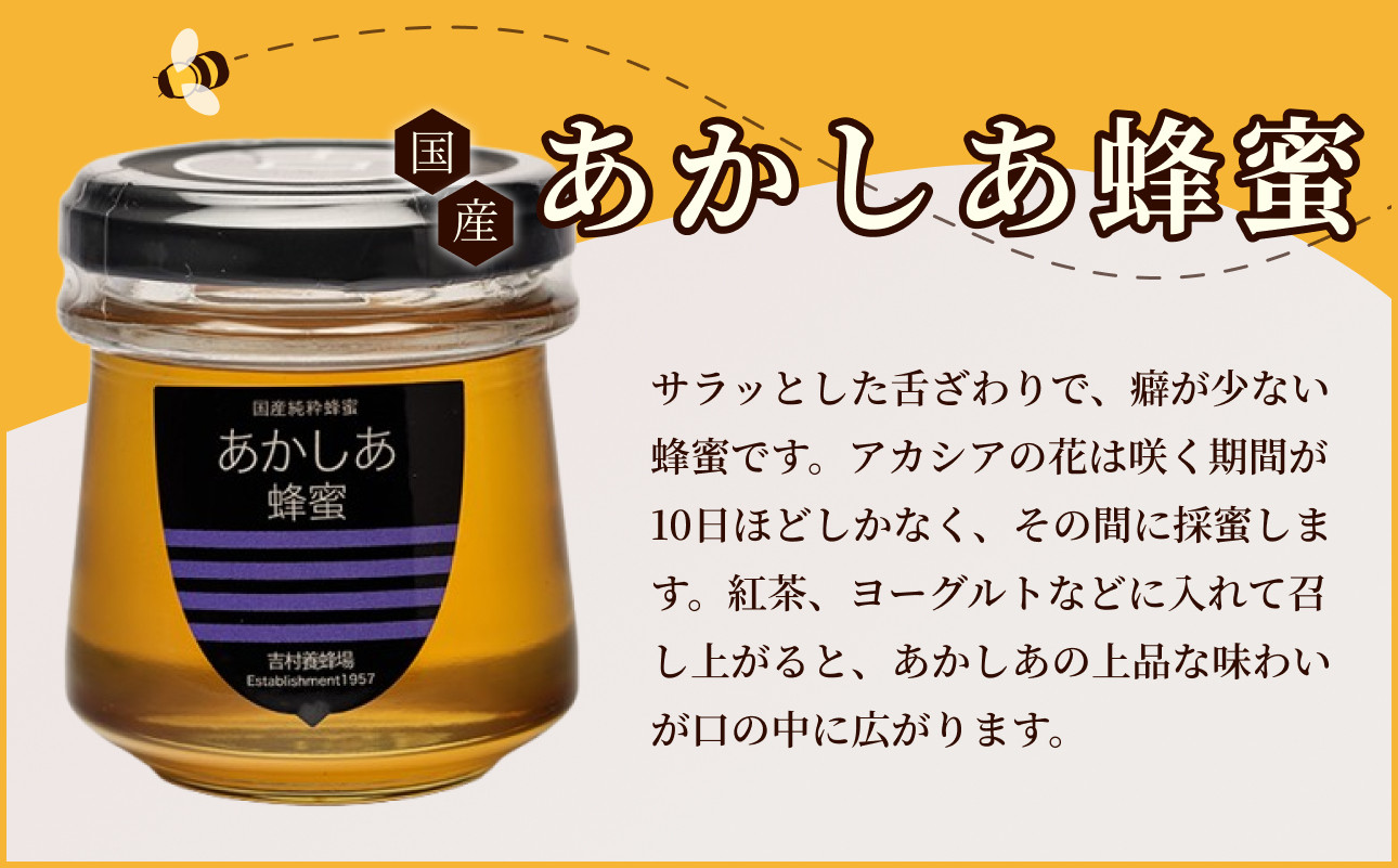 備前市で創業して68年の吉村養蜂場がお届けする、岡山県産純粋はちみつです。 あかしあ蜂蜜は、上品な香りと味がします。
