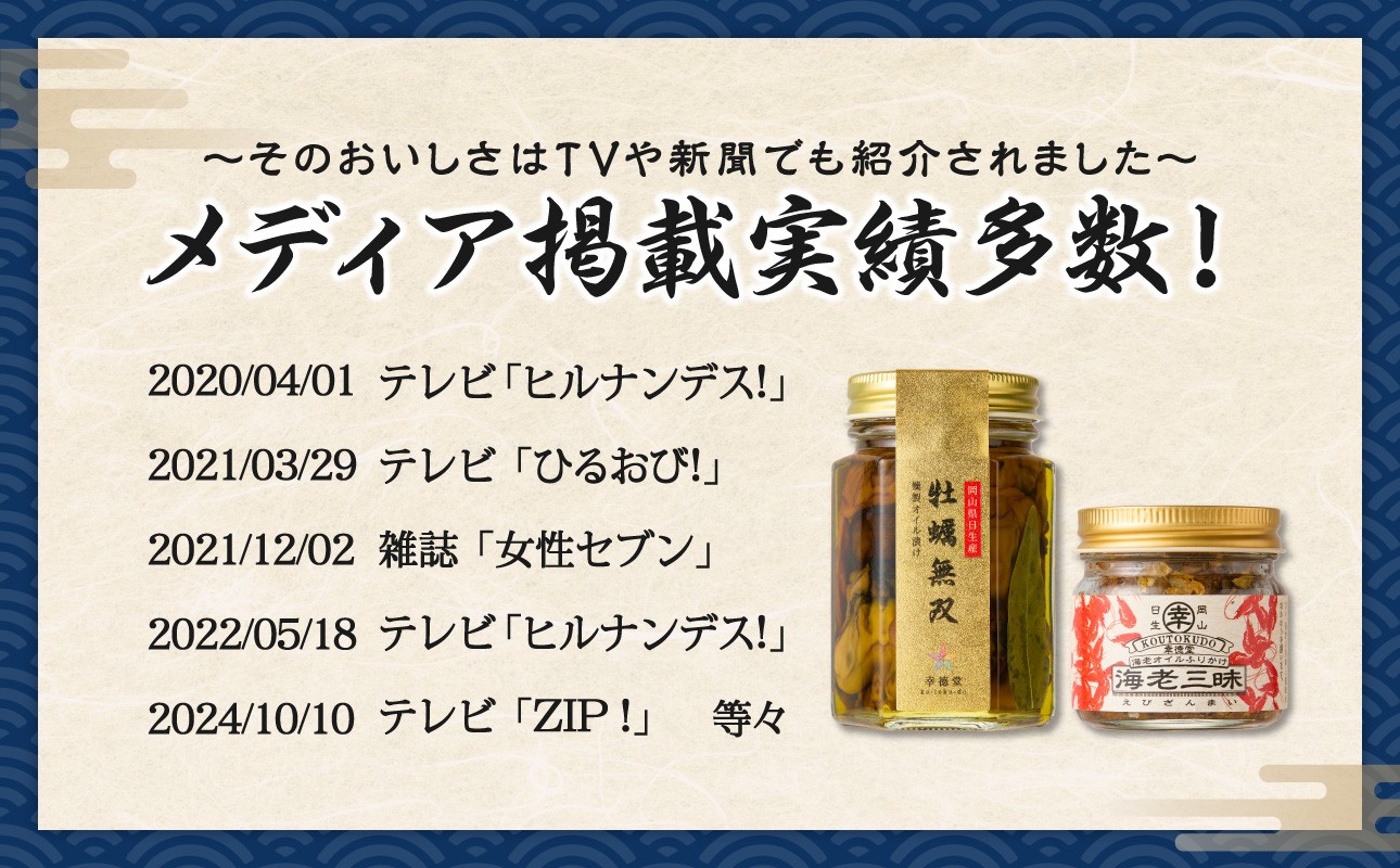 昔から故郷の日生で事業をやりたいという想いを持ち続け、数年前に『幸徳堂(こうとくどう)』を開くことが出来ました。元々、自身が岡山県漁連で働いたことで、牡蠣の生産に携わっていたこともあり、牡蠣や海老といった地域の特産品を用いた加工品を製造、提供しております。