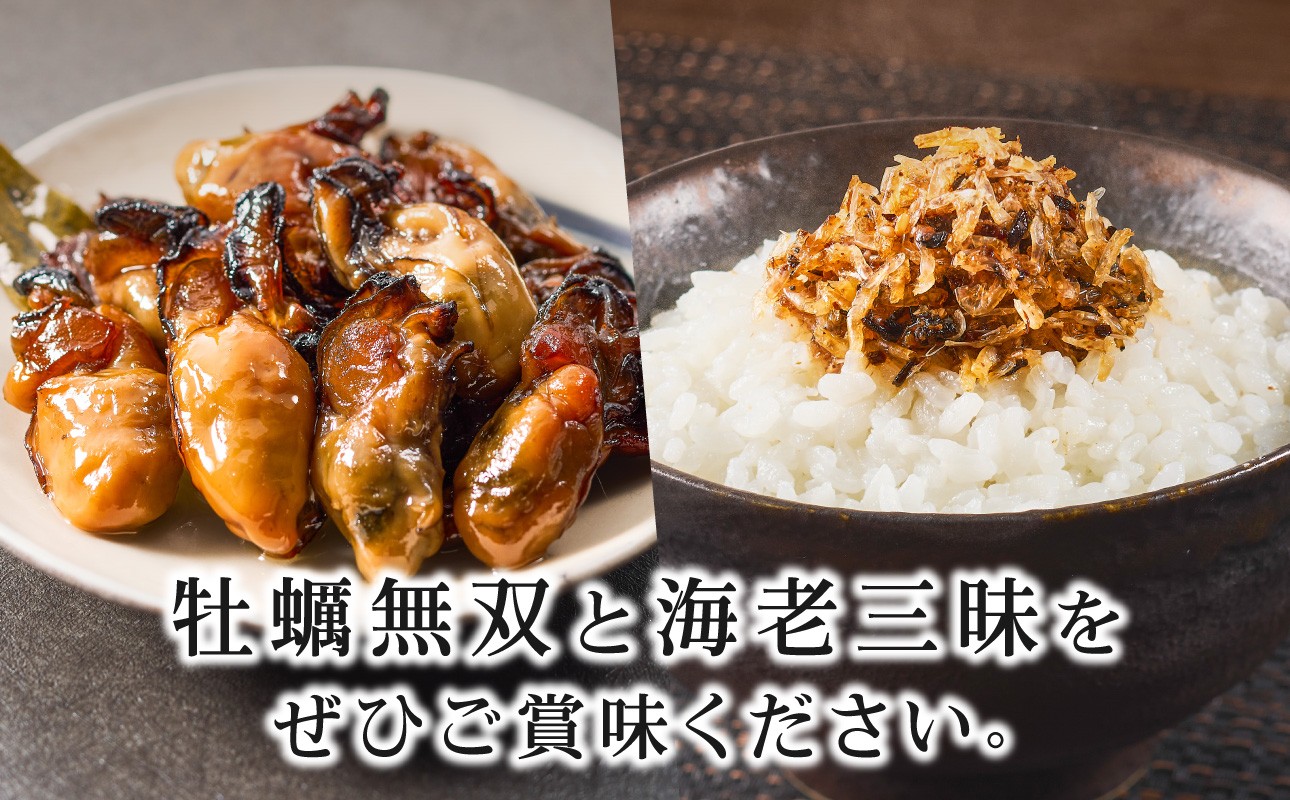 牡蠣無双(銀)は新鮮な牡蠣を即日燻製にし、ピリ辛風に味付けし、調整ごま油に漬け込んでおり、日本酒、ワイン、ビールにあう濃厚な一品です。 海老三昧は日生産干しエビと国産アミエビをふんだんに使ったご飯にのせて食べるオイルふりかけです。エビの香ばしさと旨みが塩昆布とおかかにベストマリアージュ!ご飯のおかわり間違いなしです! 万能調味料 ご飯のお供 燻製 オイル漬け