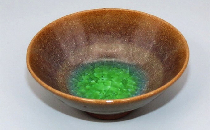 この盃は、器全体に掛けられた釉薬が緩やかに上から下へ流れて真ん中に溜まっています。溜まった釉は吸い込まれるような翡翠色で、ガラス質の釉表面は通常とは異なり、縦や横、斜めに貫入(かんにゅう)と呼ばれるヒビが入り、角度によって光が乱反射して幾重にも複層した貫入の景色が変わって見えます。日本酒や酢の物や佃煮、お酒のあて、飴やタブレットをのせて使うなど様々な用途にお使いいただけます。