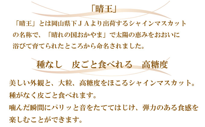 「晴王」とは岡山県下JAより出荷するシャインマスカットの名称で、「晴れの国おかやま」で太陽の恵みをおおいに浴びて育てられたところから命名されました。