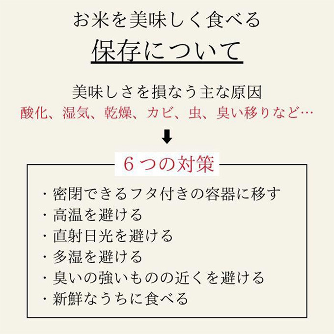 | 消費期限 | 精米から 春、夏:3週間程度、秋、冬:2か月程度 |