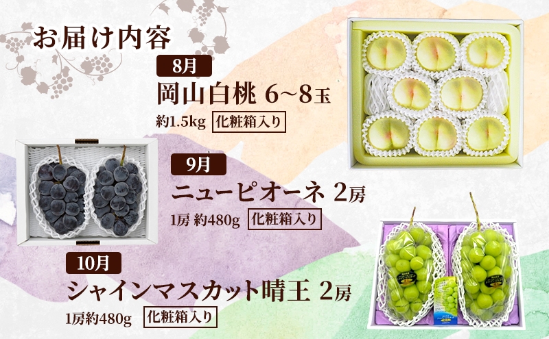 岡山の人気果物(岡山白桃、ニューピオーネ、シャインマスカット晴王)を、毎月(3ヶ月連続)お届けします!