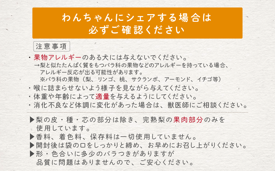 梨を食べているのと同じ栄養素ですので、人が食べても美味しいおやつとして楽しんでいただけます。