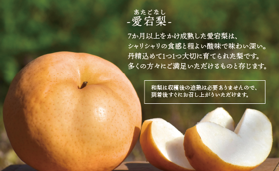 | 消費期限 | ※日持ちする梨としても知られていますが、生ものですので 稀に長期保存で傷みが発生する場合があります。到着後はお早めにお召し上がりください。 |