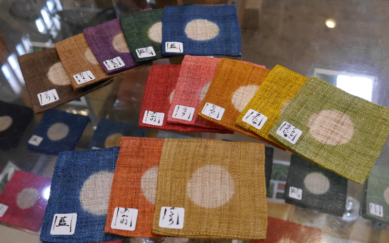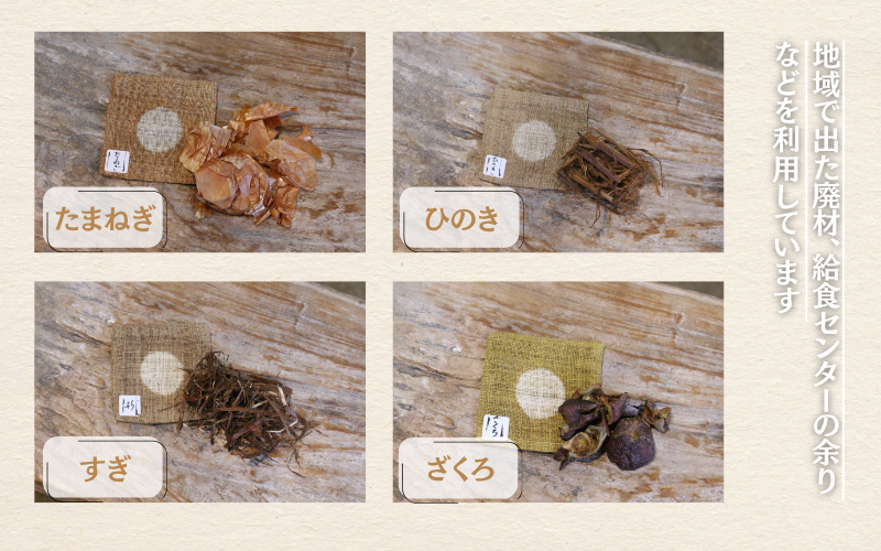 玉ねぎの皮、藍、ひのきなど、自然由来の染料で一枚ずつ丁寧に染め上げました。
