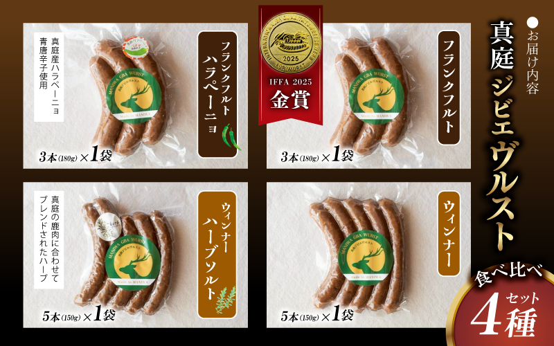 ドイツIFFA金賞フランク入り 真庭市の鹿肉ジビエブルスト4種食べ比べ 鹿肉ソーセージ 4種食べ比べセット IFFA金賞受賞フランクフルト入り / 岡山県 真庭市 鹿肉 ジビエ ブルスト BBQ アウトドア キャンプ おつまみ フランク ハラペーニョ ウィンナー ハーブ【hmwr008-01】