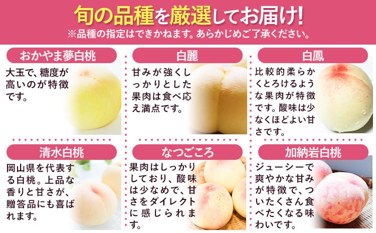 おかやま夢白桃・白麗・白鳳・清水白桃・なつごころ・加納岩白桃の中から旬の品種を厳選してお届けします。