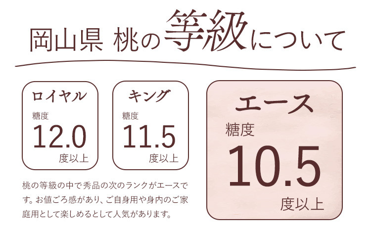 桃の等級のなかで秀品の次のランクがエースです。お値ごろ感があり、ご自身用や身内のご家族用として楽しめるとして人気があります。